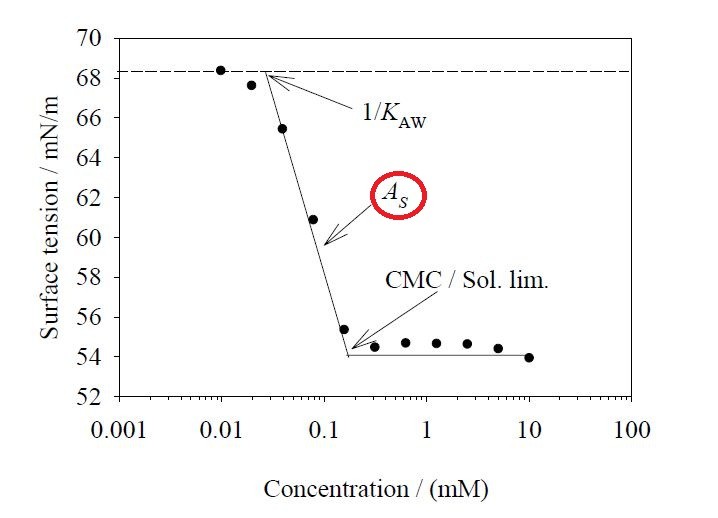 化合物分子定向和折疊決定了極性和非極性基團之間的對抗和平衡,通過真正表麵積TSA(=每個吸附分子的平均麵積)來反映。表麵積來源於吸附等溫線,即在表麵飽和的表麵過剩濃度(最大吸附值)。
